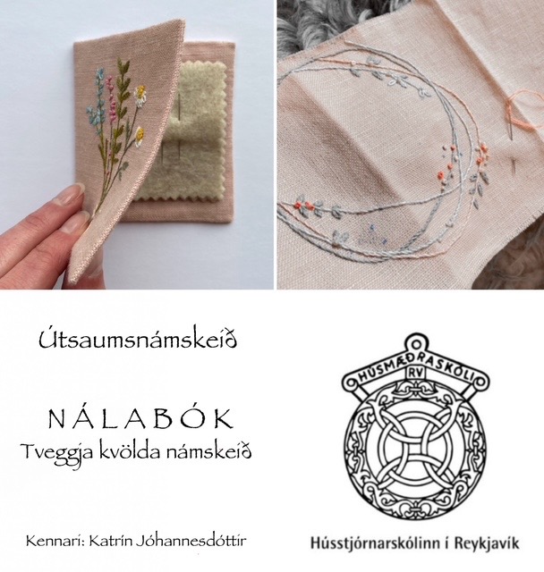 Katrín mun kenna tveggja daga útsaumsnámskeið þar sem verkefnið verður nálabók. Spor eins og lykkjuspor og fræhnútar, kontórstingur, spíralar og flatsaumur fá að njóta sín. Munstur er fært yfir á efni með prikk-aðferðinni og farið verður vel í þá aðferð.